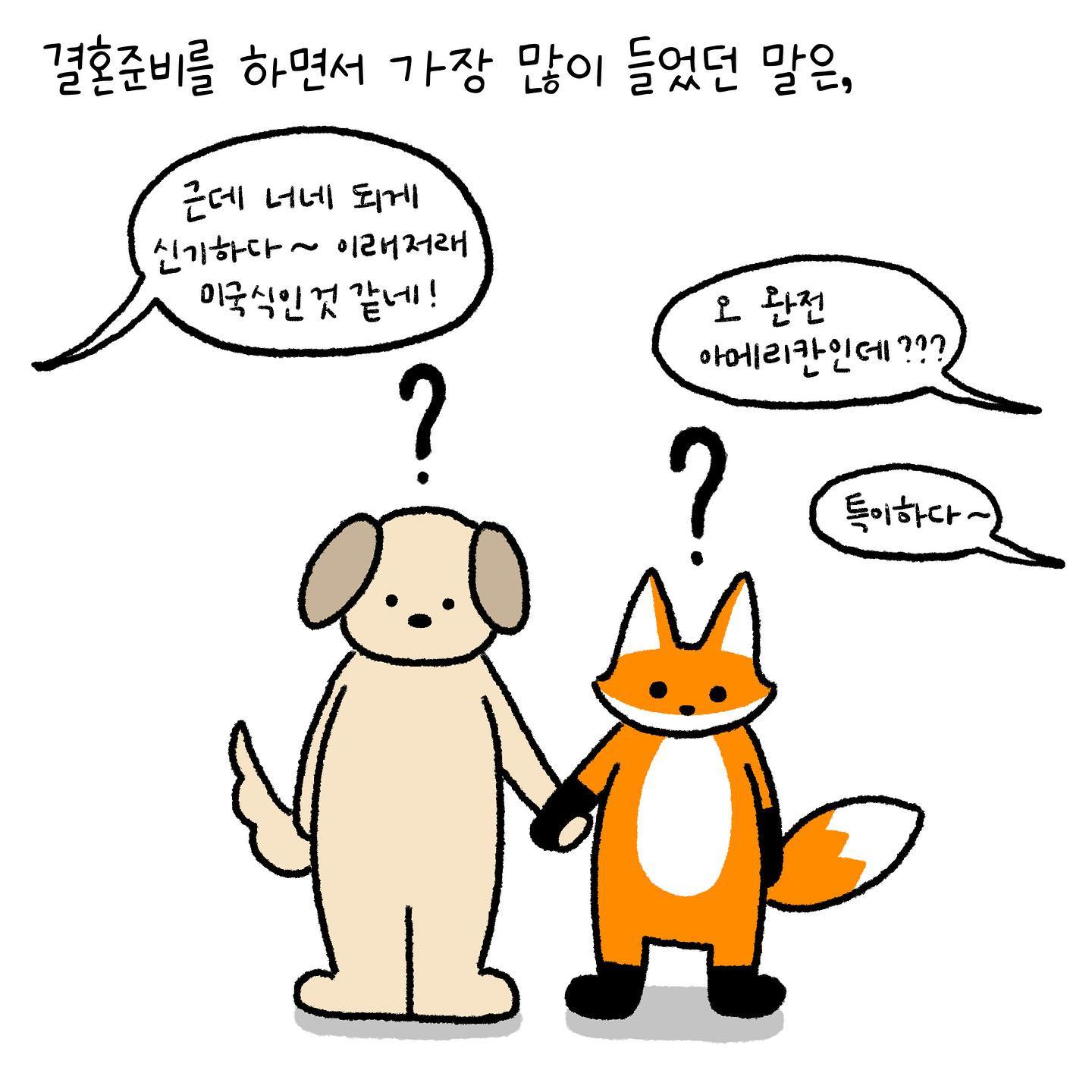 결혼 준비를 하면서 주변 친구들에게 가장 많이 들었던 말은, 너네 되게 미국식이다 였어요! 여기에서 출발한 의문으로 이번 에피는 저와 그냥이의 지극히 개인적인 생각입니다! (사람에 따라 아닐 수 있음 주의) 사람마다도, 나라마다도 다른 결혼 문화! 문화와 환경이 다르니 이래저래 다른 게 당연하지만 그것마저도 새삼 재미있고 신기한 것 같아요