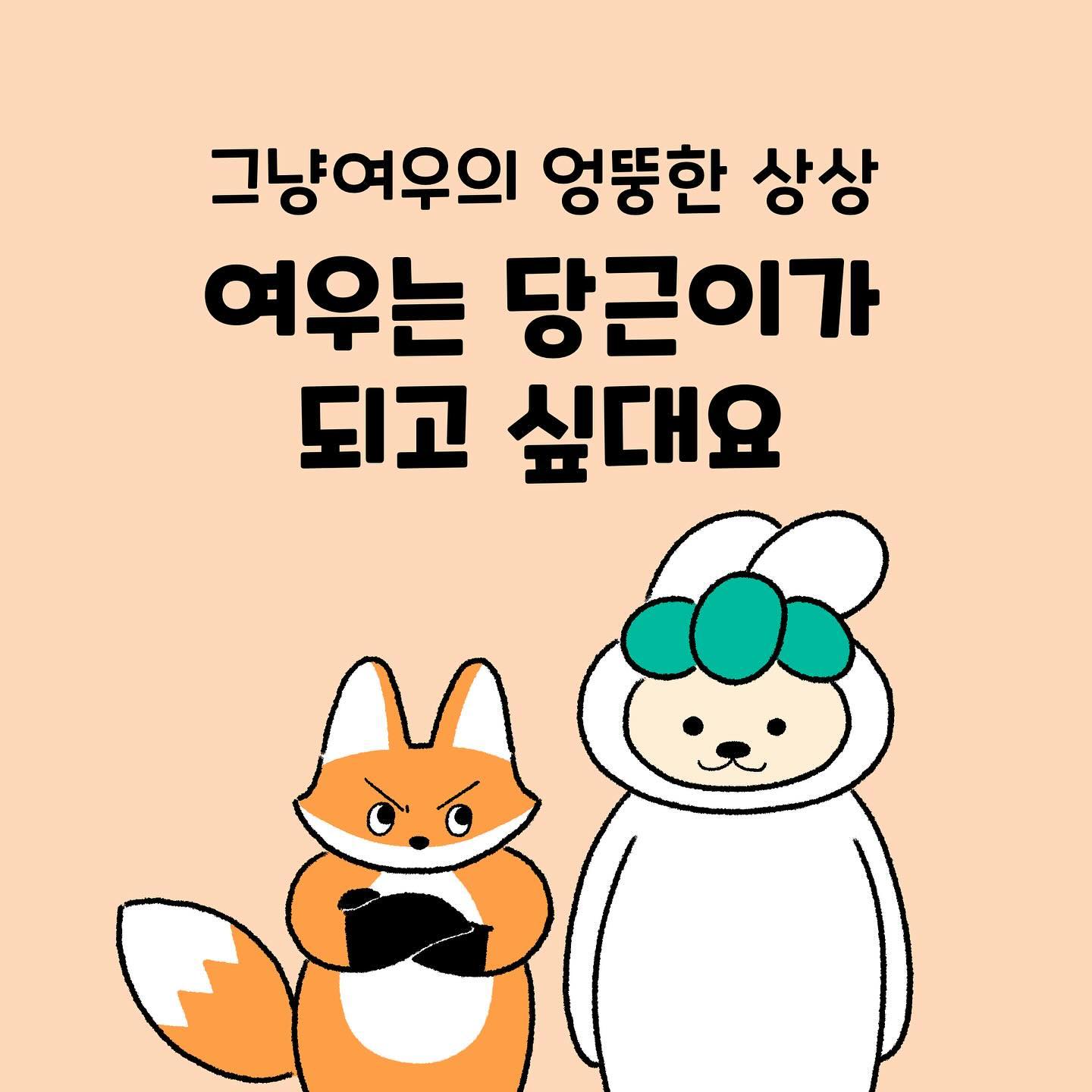 지난 번에 ‘남친 살림살이 내다팔기’에 나온 당근이 여우를 많이 좋아해주셔서 그려본 특별편! 여러분 그거 아시나요? 당근이 캐릭터는 토끼가 아니라 토끼 탈을 쓴 강아지래요😮 왜 하필 강아지일까 찾아봤더니 👉🏻 동네 곳곳을 뽈뽈거리고 다니는 강아지처럼 이웃들에게 사랑받는 채널 역할을 하겠다는 뜻이라네요 우리나라에서는 여우에 대한 인식이 좋지 않잖아요 그래서 이걸 두고 그냥이와 이야기를 하다가 엉뚱한 상상을 해본 결과물이랍니다!