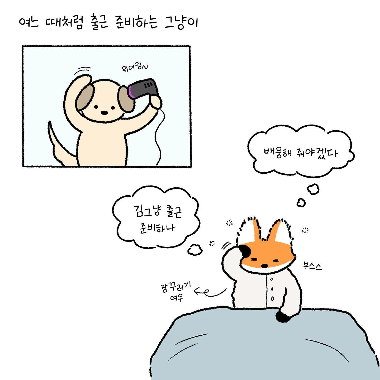 털잠옷을 입고 난방을 켜고 오리털 이불을 덮어도 겨울 아침의 그 찬 공기는 어쩔 수 없더라구요 출근하는 그냥이 배웅해주려고 나갔는데 왠지 추워서 손을 소매에 넣었는데, 그걸 보고 내시 여우라고 놀리는 그냥이ㅎㅎㅎㅎㅎㅎㅎ 저렇게 짤막하게 상황극하고 그냥이는 웃으면서 나갔어요 저는 지난 화 북극곰에 이어 이번에는 내시가 되었습니다!🙋🏻♀️ + 빨리 봄 왔으면..!